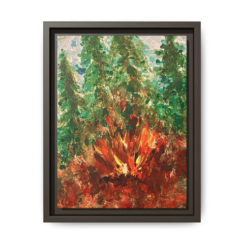 This matte canvas framed print brings a warm, painterly wildfire scene into your home with deep greens and ember-orange highlights. The textured cotton-poly canvas and unique JONDO coating keep brushlike strokes vivid while the slim pine frame adds grounded, natural character. Hang it in a cozy reading nook, above a mantel, or on a gallery wall to introduce woodland energy and quiet heat — the feeling of standing at the edge of a forest as the ground glows and the trees hold their breath. The print’s rich, layered color and museum-style finish invite long looks and start conversations about place, memory, and the wildness that lives close to home.