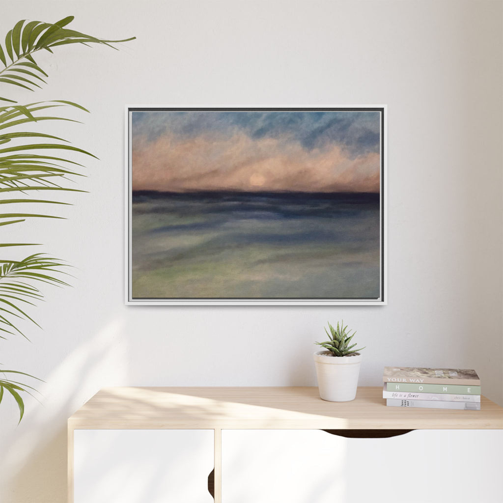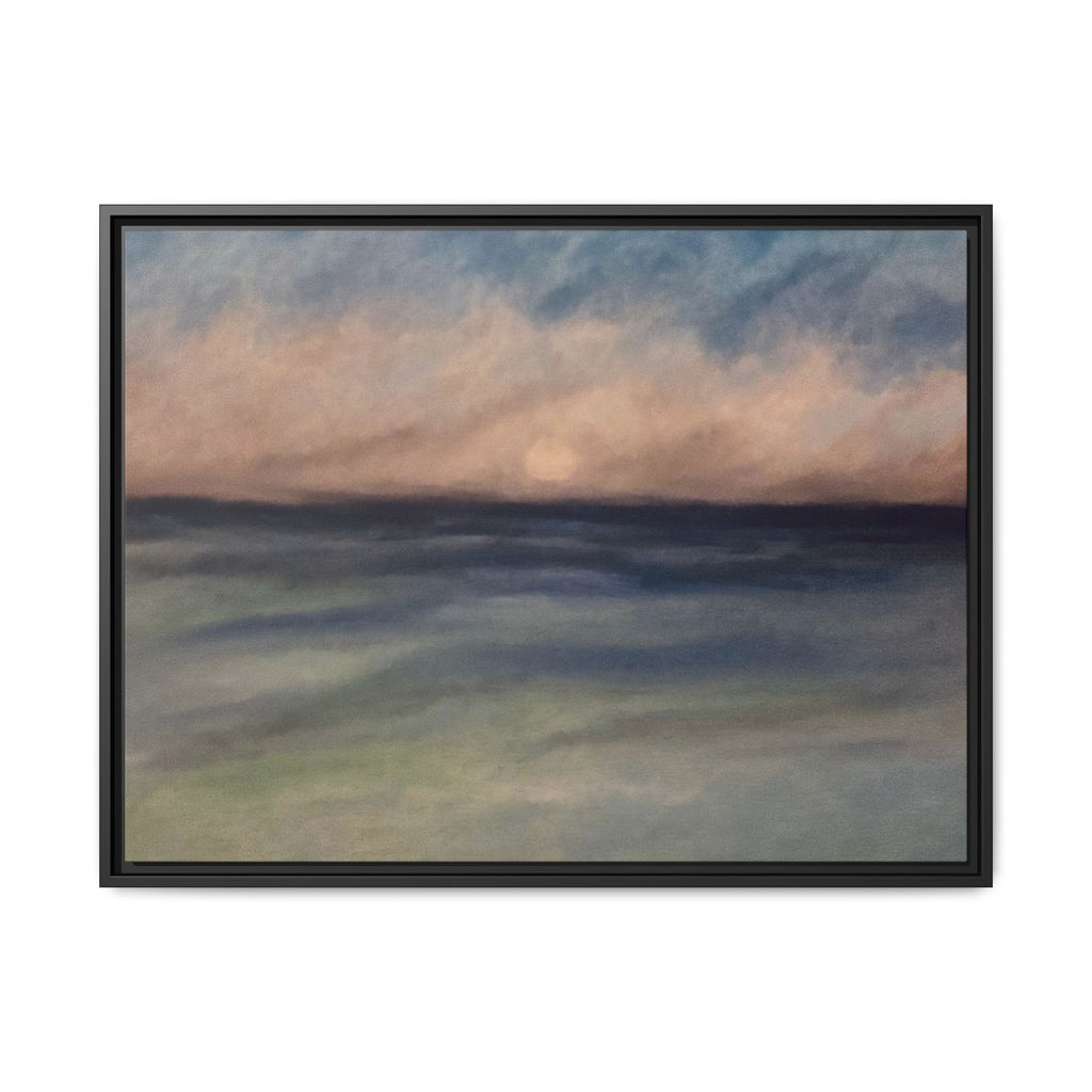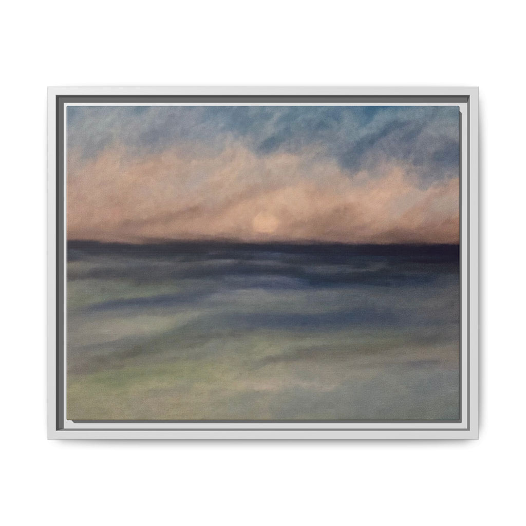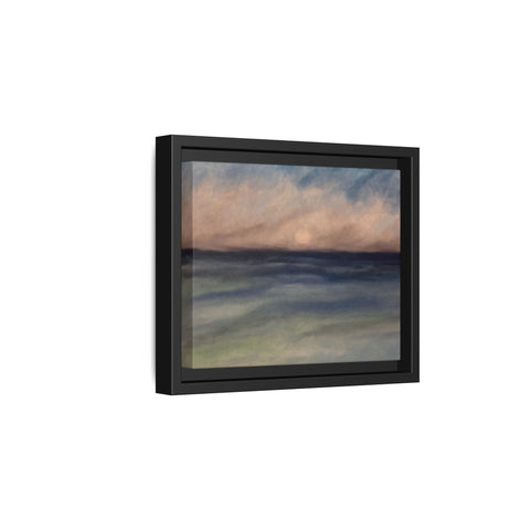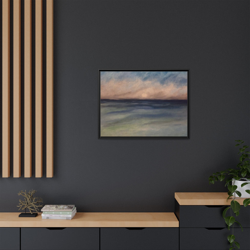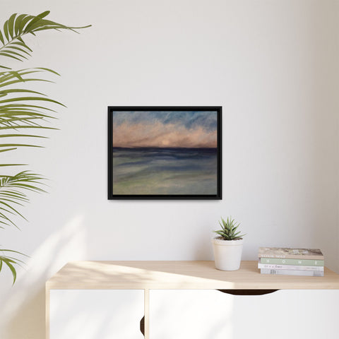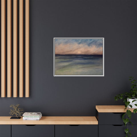 A matte canvas print with a slim framed edge that brings a soft, atmospheric seascape into your room. The layered washes stormy greys and blue sit above muted greens and greys, rendered with rich, Greenguard Gold-certified inks for color that feels alive but never garish. The texture of the cotton-poly canvas and the subtle, non-reflective finish make it read like an original painting from across the room. Stretched over sustainably sourced pine and mounted in a sleek black or natural frame, this piece arrives ready to hang with sawtooth hardware — an easy way to introduce calm, coastal light and painterly depth into a living room, hallway, or study.