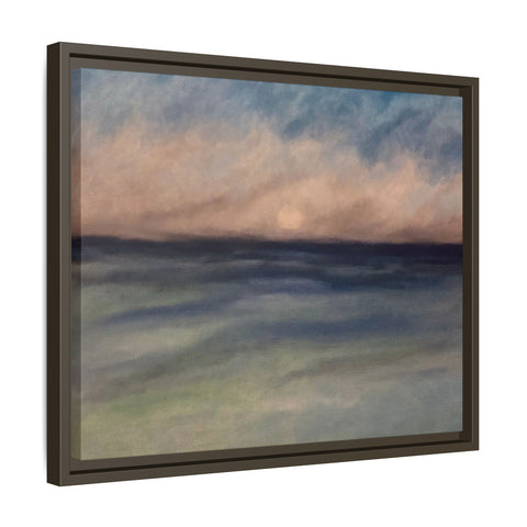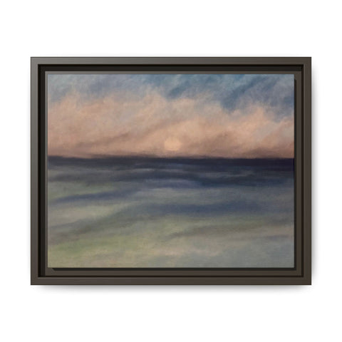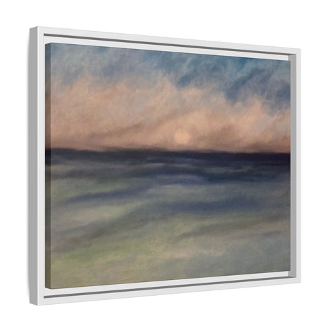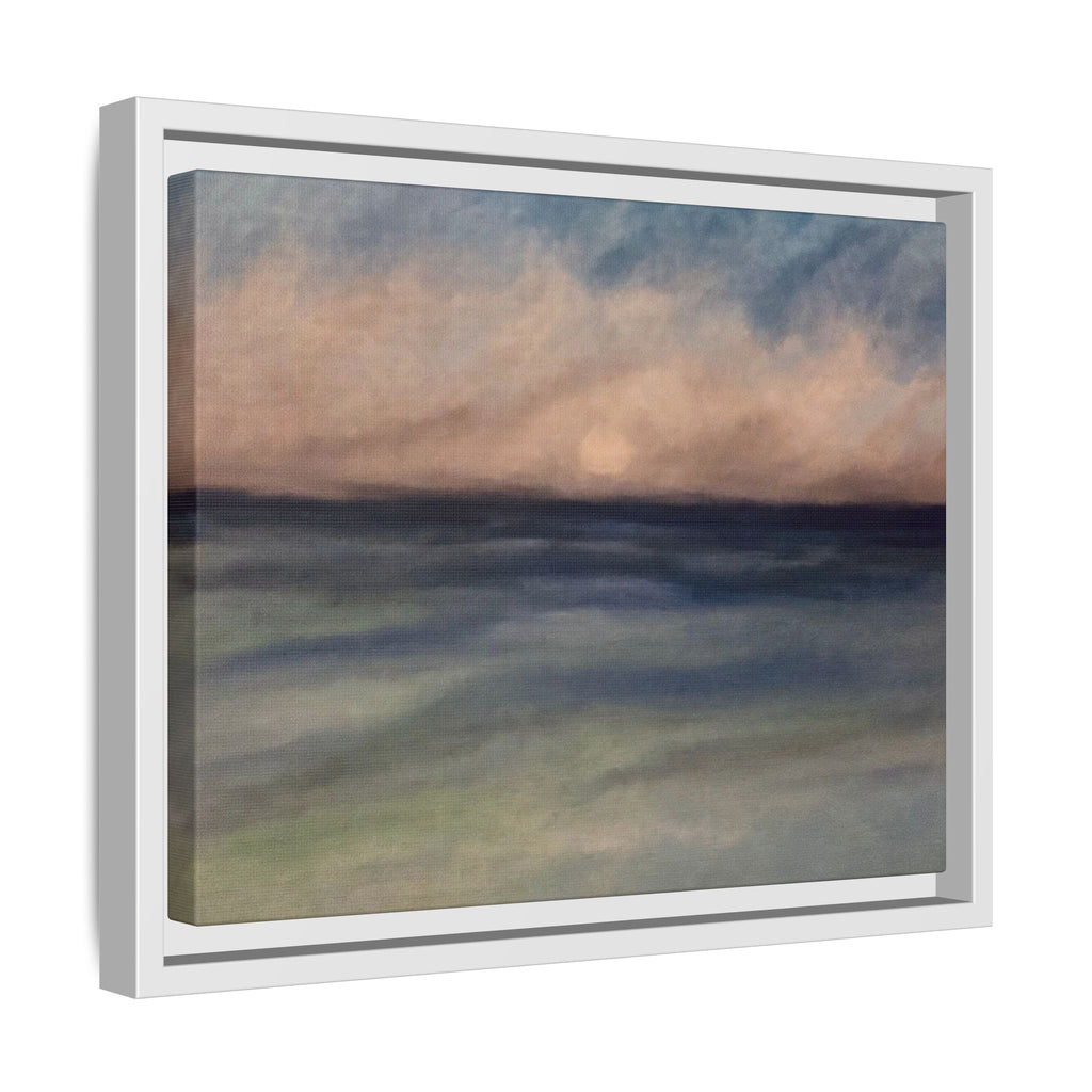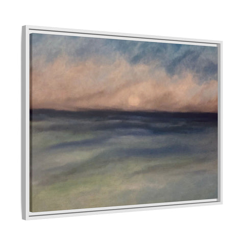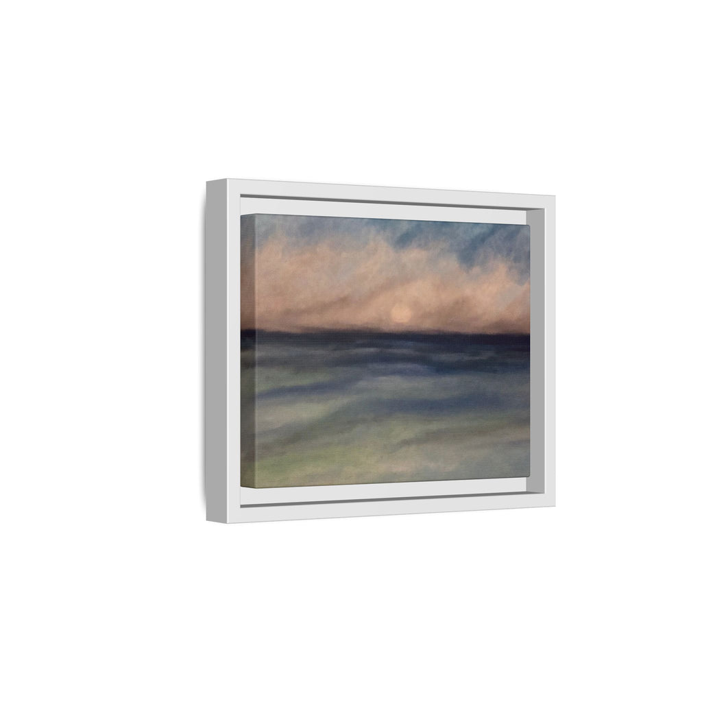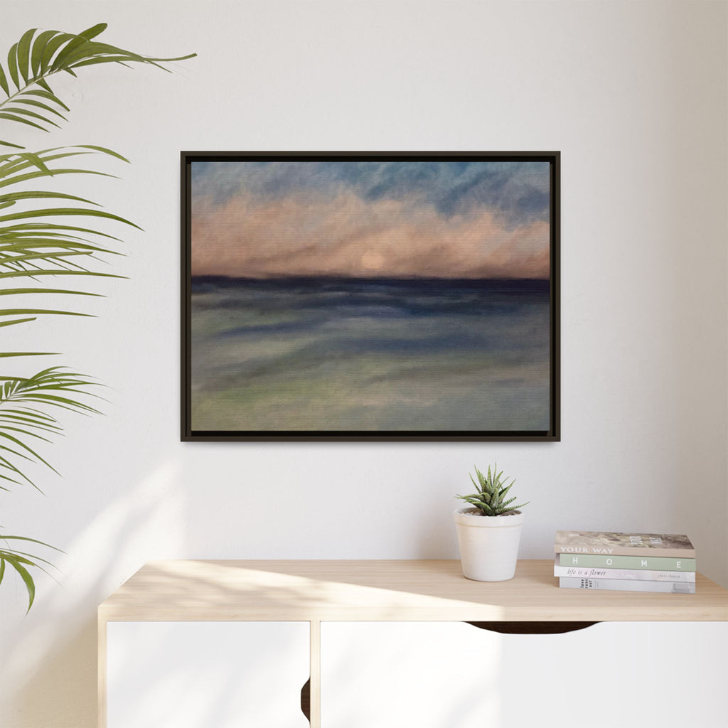 A matte canvas print with a slim framed edge that brings a soft, atmospheric seascape into your room. The layered washes stormy greys and blue sit above muted greens and greys, rendered with rich, Greenguard Gold-certified inks for color that feels alive but never garish. The texture of the cotton-poly canvas and the subtle, non-reflective finish make it read like an original painting from across the room. Stretched over sustainably sourced pine and mounted in a sleek black or natural frame, this piece arrives ready to hang with sawtooth hardware — an easy way to introduce calm, coastal light and painterly depth into a living room, hallway, or study.