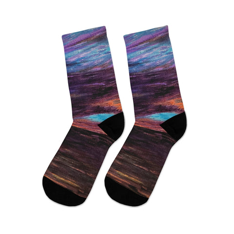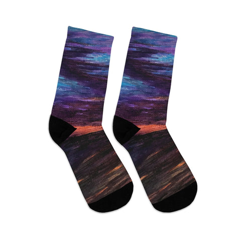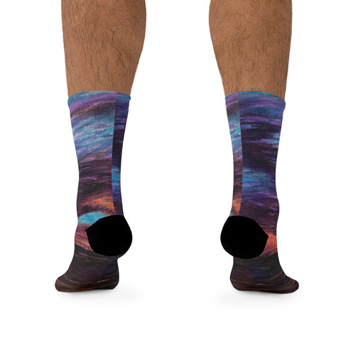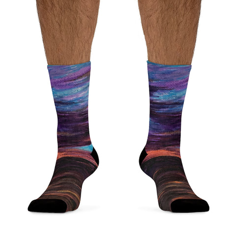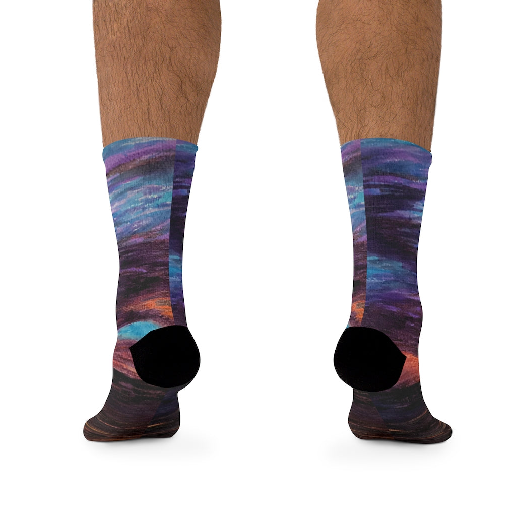 The R3 Nightly DTG socks are made using a proprietary blend of yarns specially sourced by Tribe Socks. They are 200 needle knit crew with half terry cushioned button for extra support and comfort. They are a true one size fits most, and are available up to size 12 male (U.S.). They have an unprecedented amount of stretch with durable print quality.