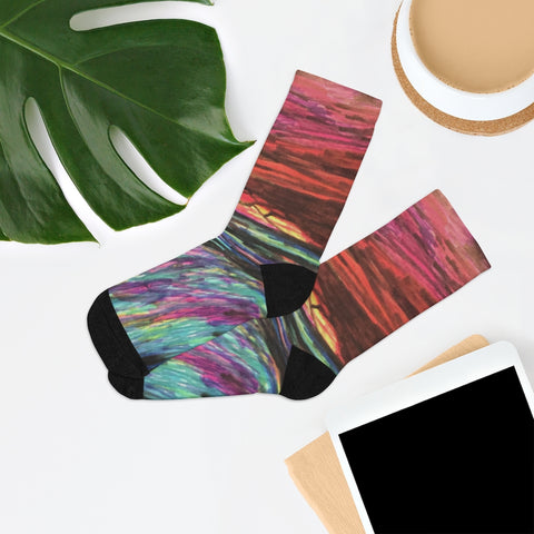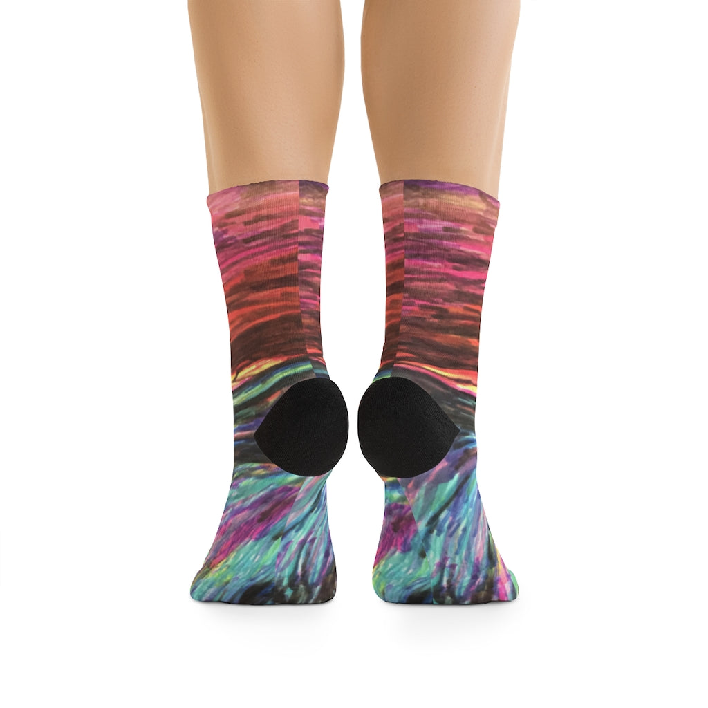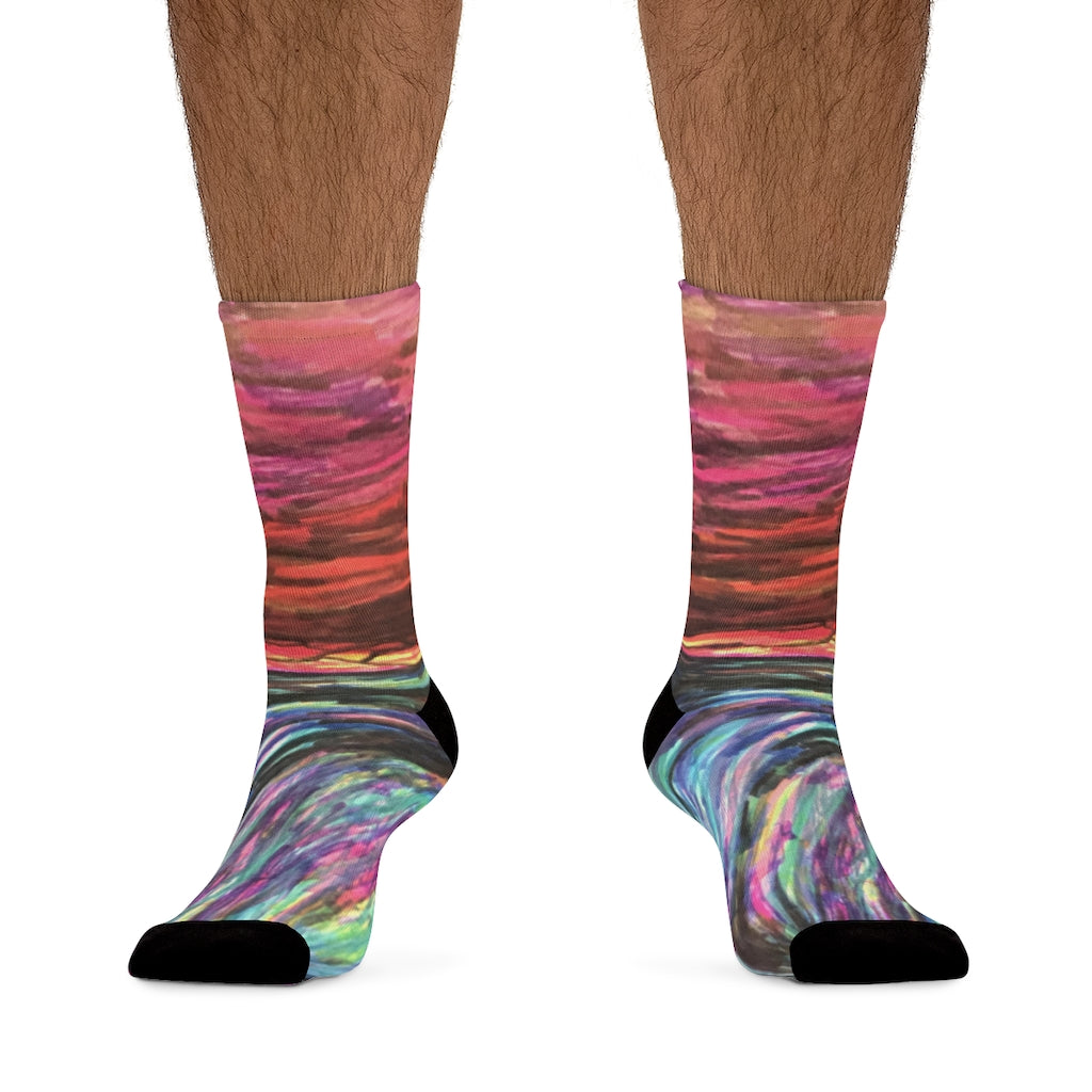 Tribe DTG socks are made using a proprietary blend of yarns specially sourced by Tribe Socks. They are 200 needle knit crew with half terry cushioned button for extra support and comfort. They are a true one size fits most, and are available up to size 12 male (U.S.). They have an unprecedented amount of stretch with durable print quality.
