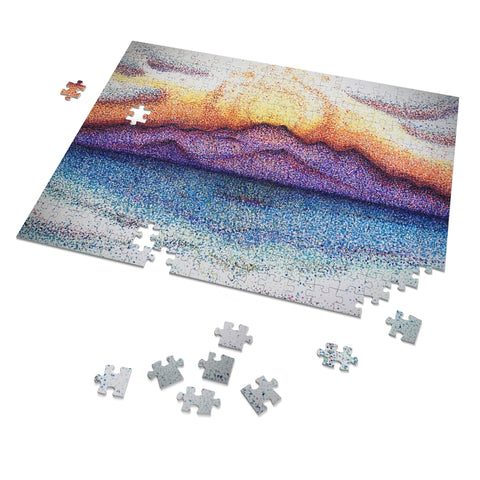 My painting is sublimated on chipboard material, then finished in satin. This diecut puzzle board comes contained in a stylish metal tin. The game’s 252 precisely interlocking pieces make an excellent gift for any soon-to-be puzzled enthusiasts.