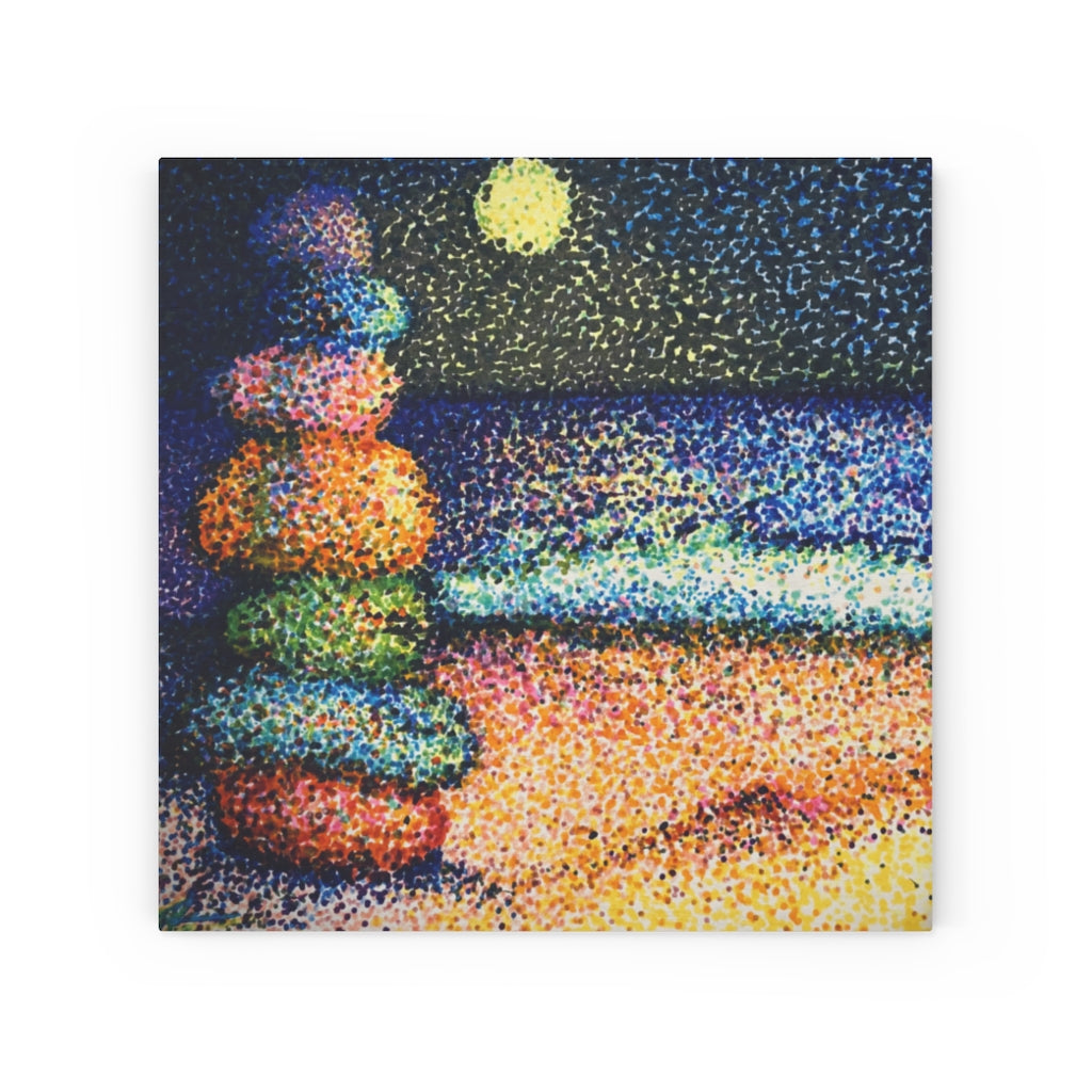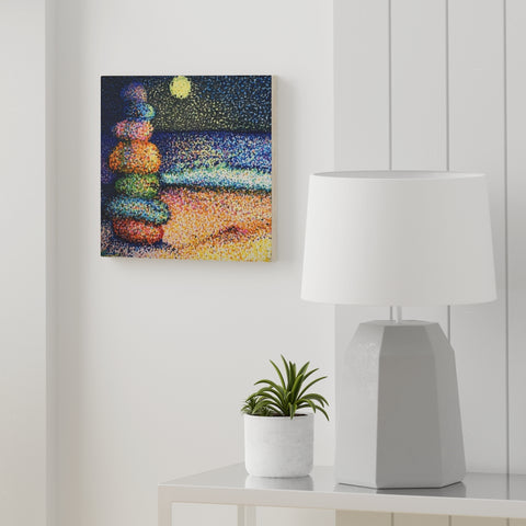 "Stacked" is a three-piece set about balance. Morning, noon, and night. It is done in my contemporary pointillism style.