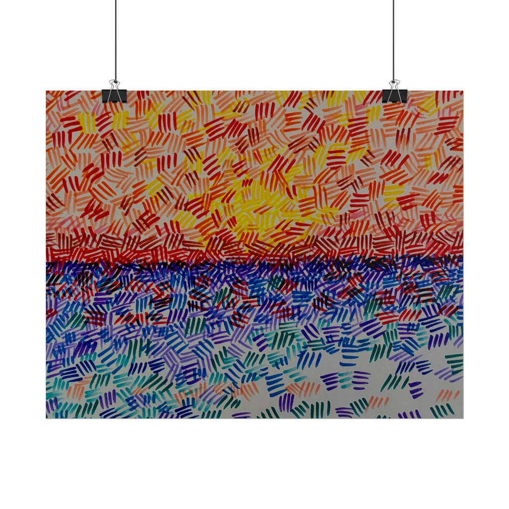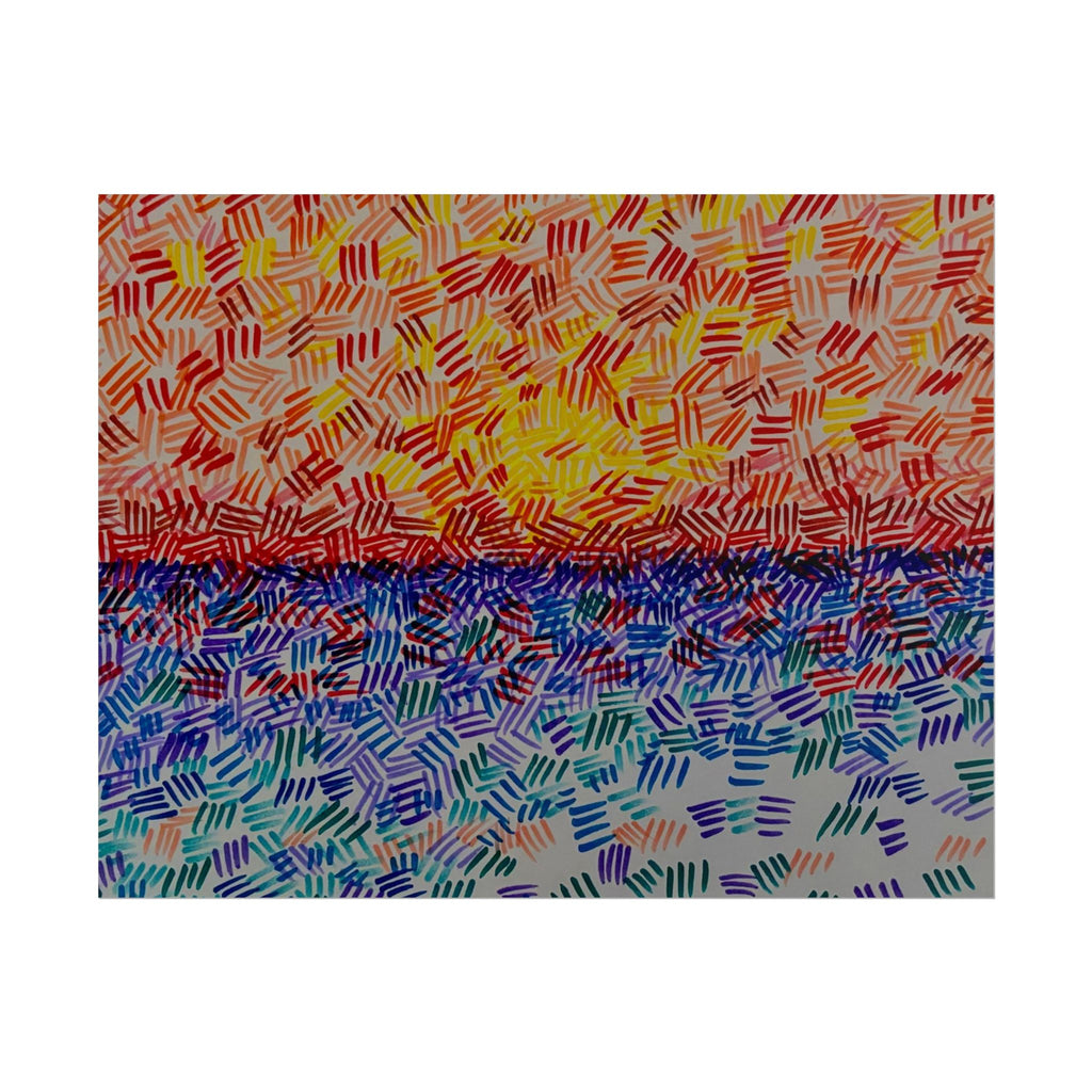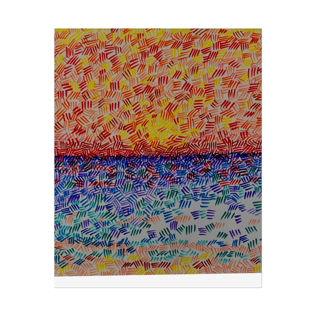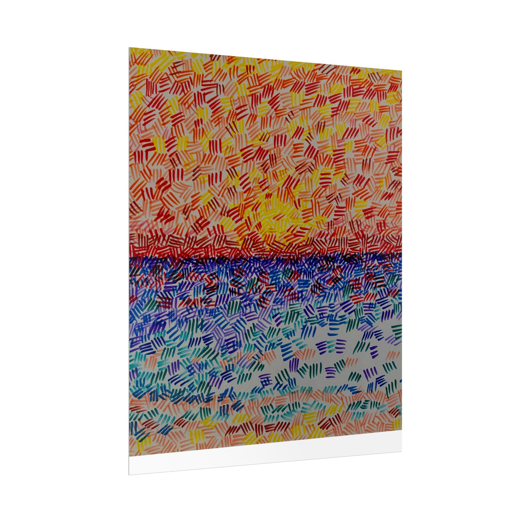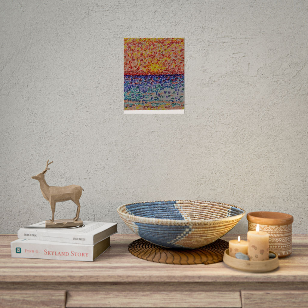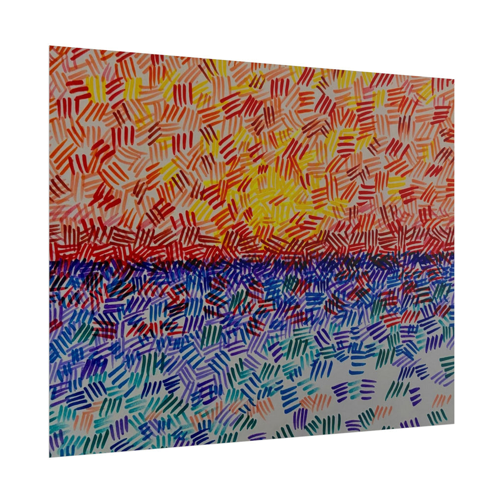 This rolled poster captures a vivid, hand-painted seascape made from short, rhythmic brush marks. Warm oranges and yellows bloom across the sky, fading into a saturated horizon that meets a cool, shimmering sea of blues and teals. The textured, mosaic-like strokes give the image movement — as if sunlight is breaking through a patterned veil — and the abstract quality lets it read equally well as a sunrise, sunset, or an impression of light on water. It hangs easily in living rooms, studios, or work nooks to bring a burst of color and tactile energy to the wall. Choose from fine art, semi-glossy, or matte papers and multiple sizes and orientations to match your space and framing style.