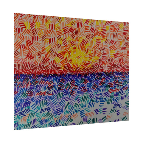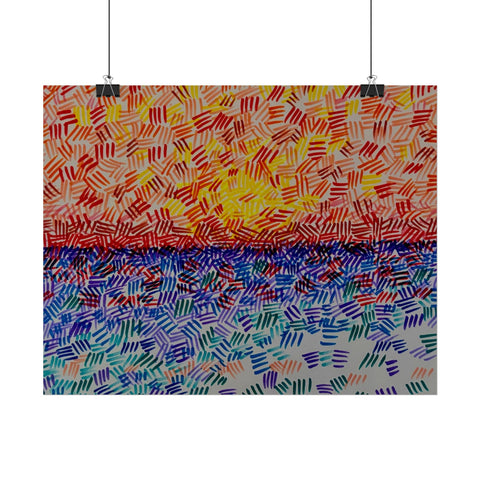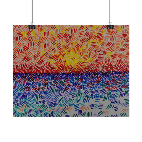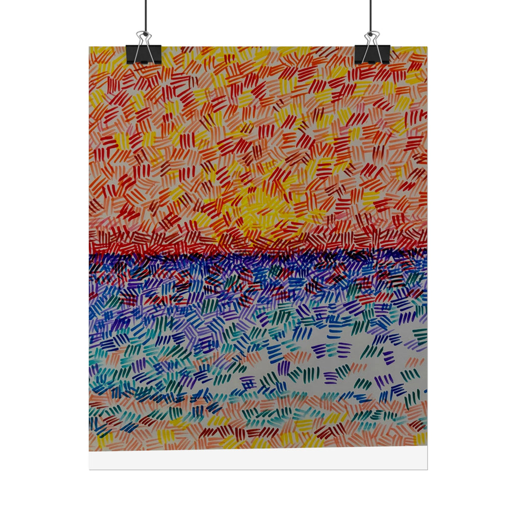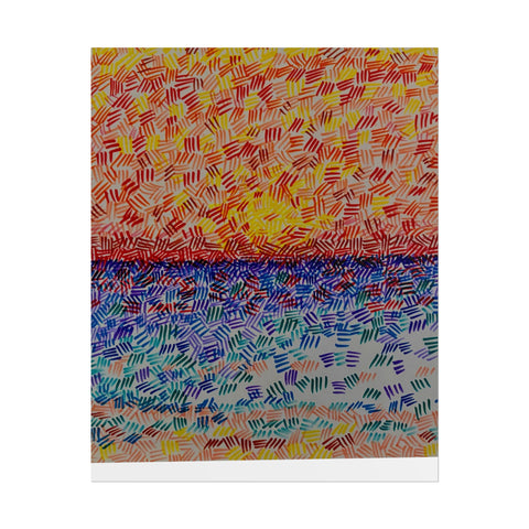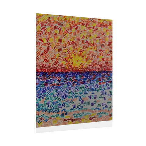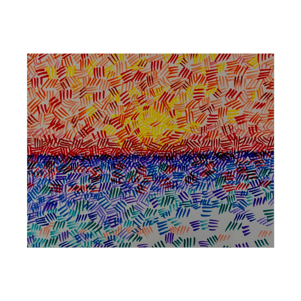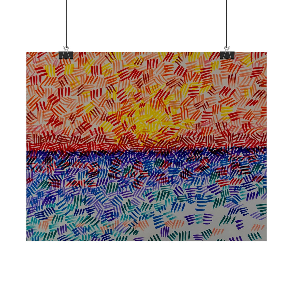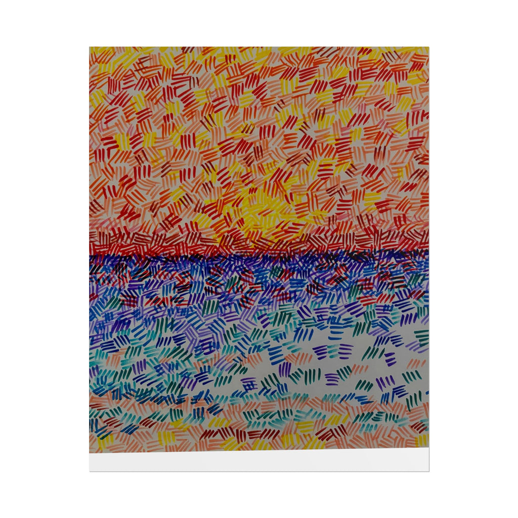 This rolled poster captures a vivid, hand-painted seascape made from short, rhythmic brush marks. Warm oranges and yellows bloom across the sky, fading into a saturated horizon that meets a cool, shimmering sea of blues and teals. The textured, mosaic-like strokes give the image movement — as if sunlight is breaking through a patterned veil — and the abstract quality lets it read equally well as a sunrise, sunset, or an impression of light on water. It hangs easily in living rooms, studios, or work nooks to bring a burst of color and tactile energy to the wall. Choose from fine art, semi-glossy, or matte papers and multiple sizes and orientations to match your space and framing style.