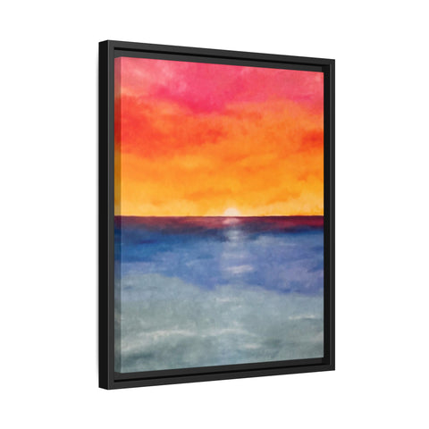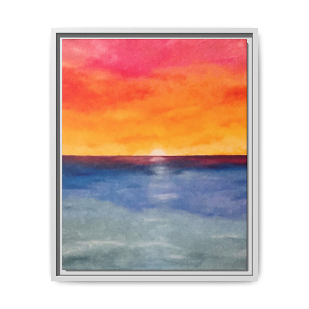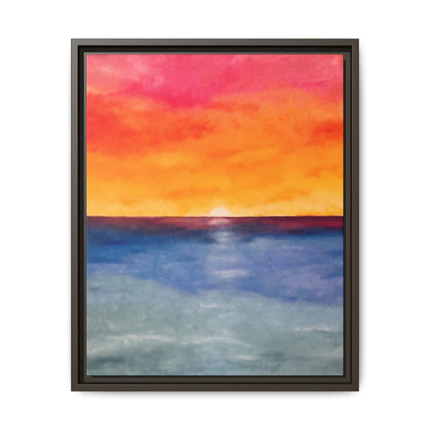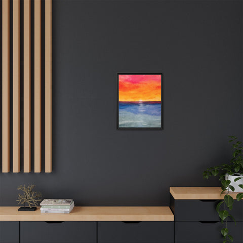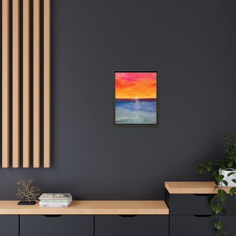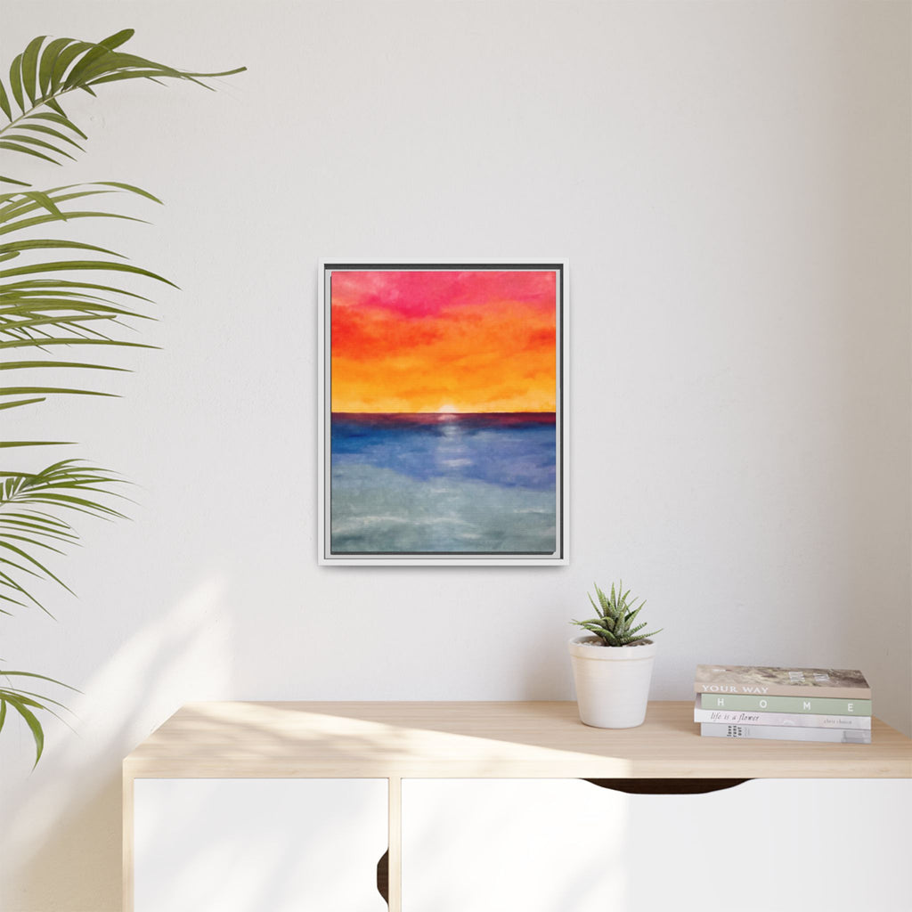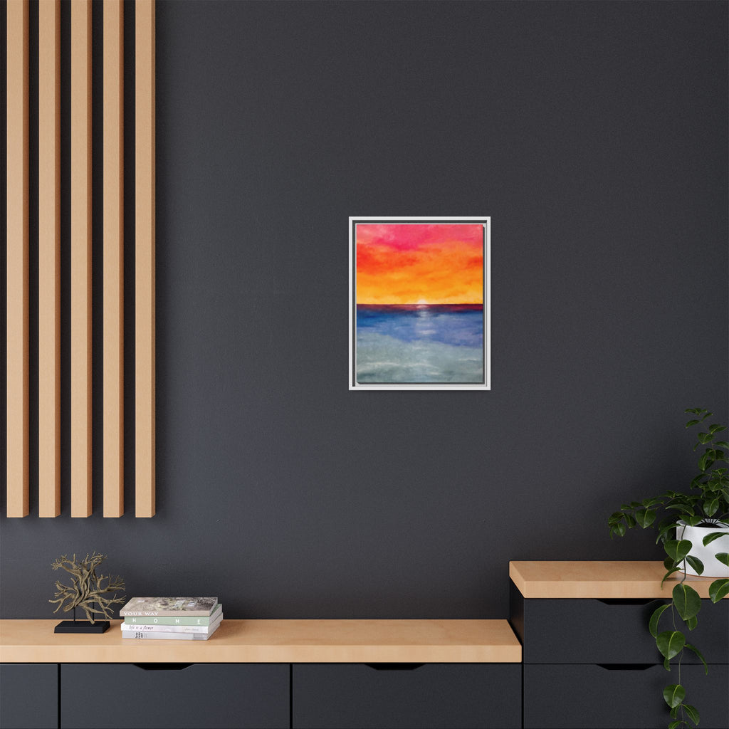 A framed matte canvas print that brings a warm, painterly sunset into your space. Rich washes of coral, tangerine, and sapphire blend into a soft horizon — like the last light slipping into a calm sea. The slim pine frame and matte finish keep reflections minimal and let the colors read deeply from any angle. Hang it above a console, nest it into a gallery wall, or place it where you want an instant moment of evening calm. The sustainable materials and low-VOC latex inks mean this piece looks vibrant while staying mindful of the environment.