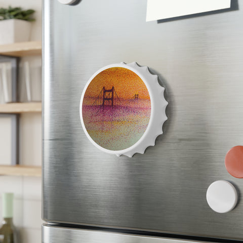 A compact, magnetic bottle opener shaped like a bottle cap, featuring my Goldwn Gate pointillism piece. The printed polycarbonate top shows a soft gradient of sunset oranges and purples with a delicate bridge silhouette rising through mist. Flip it over to find two metal opening mechanisms and strong magnets that hold it to refrigerators or metal surfaces until the next cold drink calls.